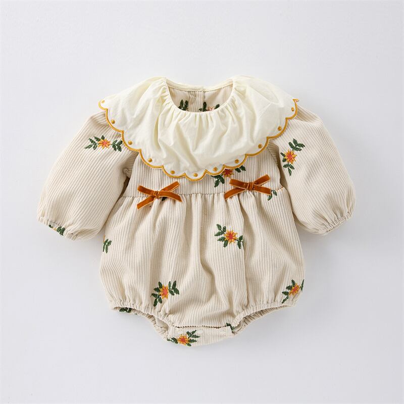 春新作 ベビー服 女の子 刺繍花柄 リボン付き 長袖 ロンパース 可愛い カバーオール 子供服