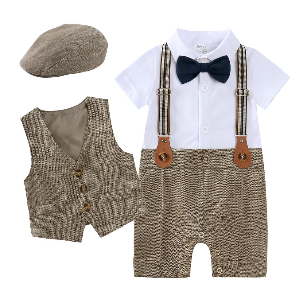 ◆男の子のおしゃれを一層引き立てる夏向けのロンパース、ベスト、帽子の3点セットが登場!このスタイリッシュな組み合わせは、特別な日をより素敵に演出します。素敵な思い出をこのアイテムで彩ってください!