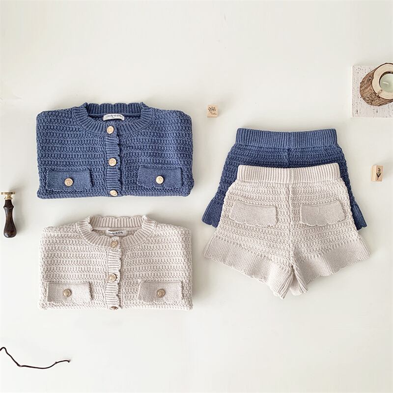 カラーは、ベージュとブルーの美しい2色展開。お子様の可愛らしさを引き立てること間違いなし!このニットセットアップを見逃さないでください!