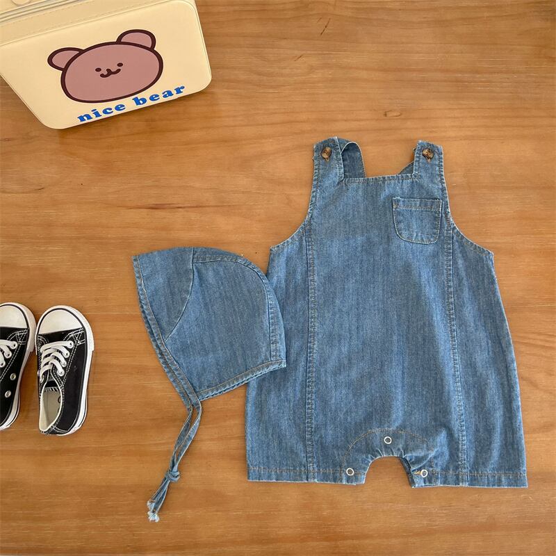 夏新作 ベビー服 デニム ロンパース サロペット ボンネット付き 子供服 可愛い 無地