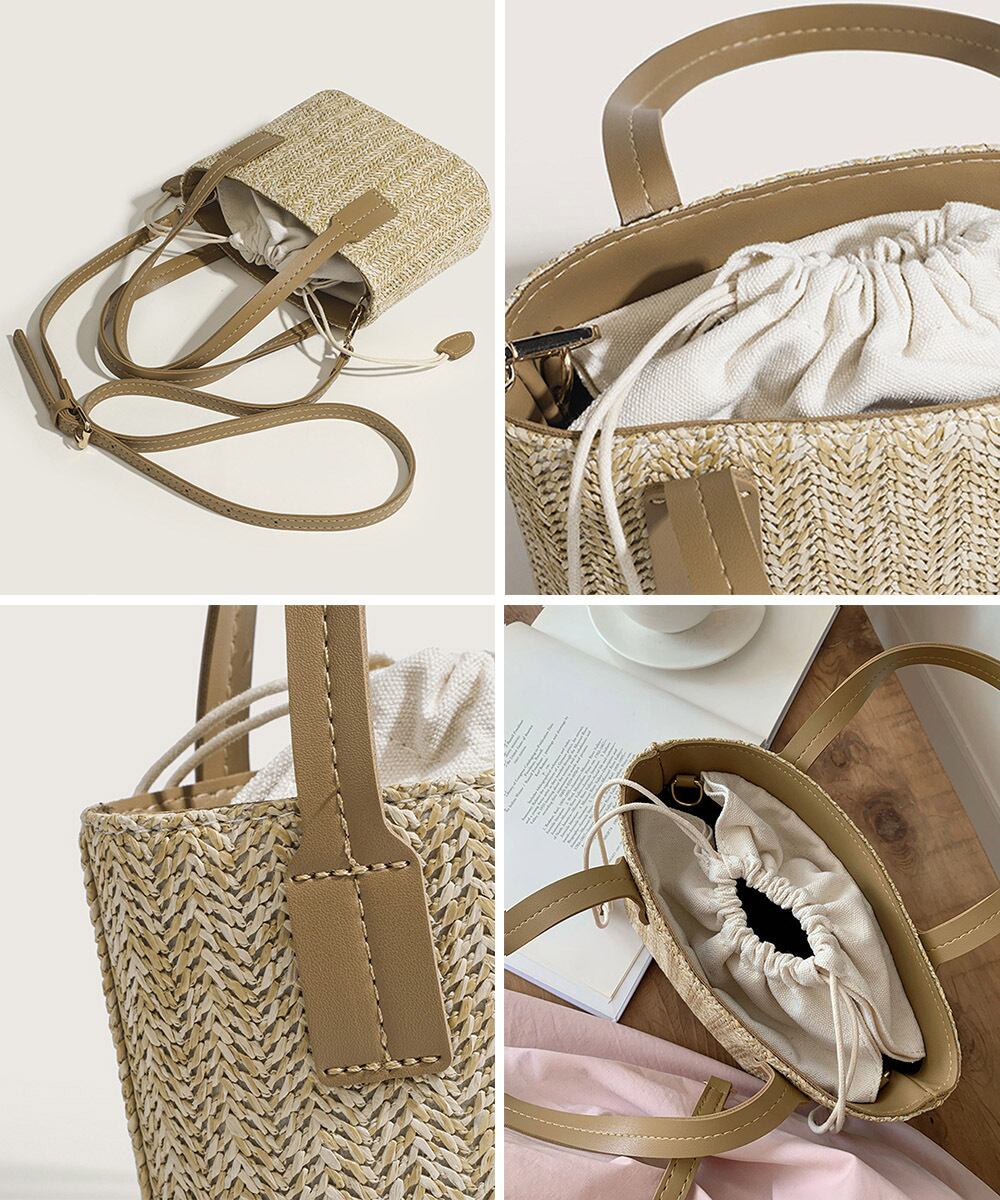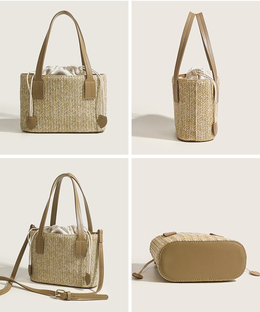 夏っぽい麦わら素材とフェイクレザーがカジュアルになり過ぎず、小さめで持ち運びも楽々