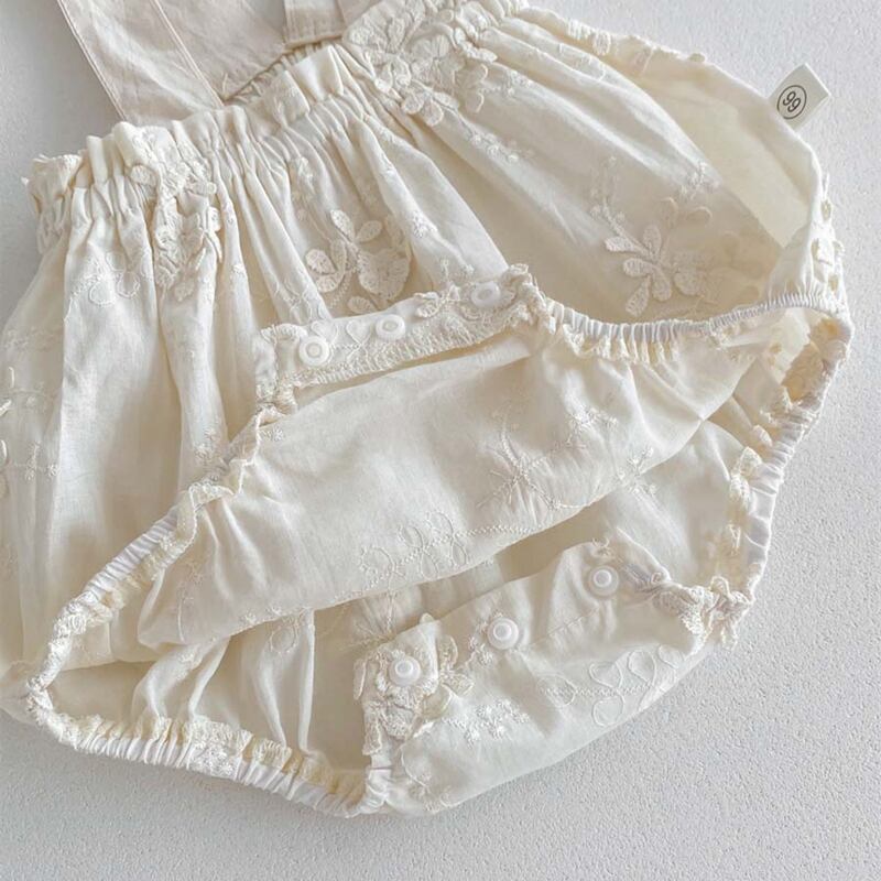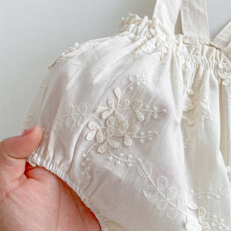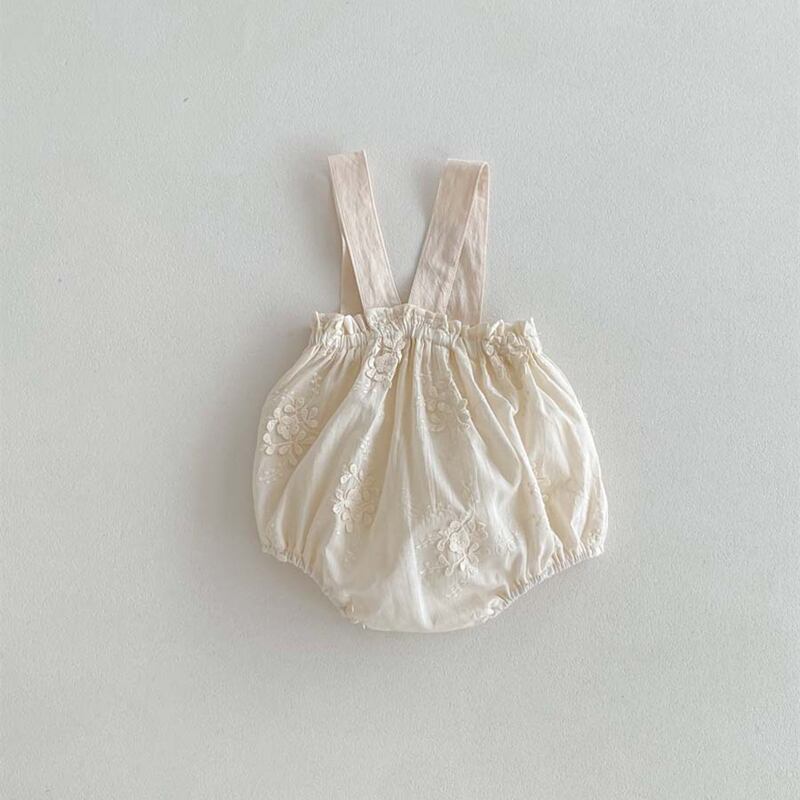 可愛い刺繍がポイントの夏新作ベビー服、サロペットロンパースが登場しました!柔らかなコットン素材で作られたこのロンパースは、おしゃれな女の子にピッタリの一着です。お出かけにもお家で過ごす日にも、重宝すること間違いなし。