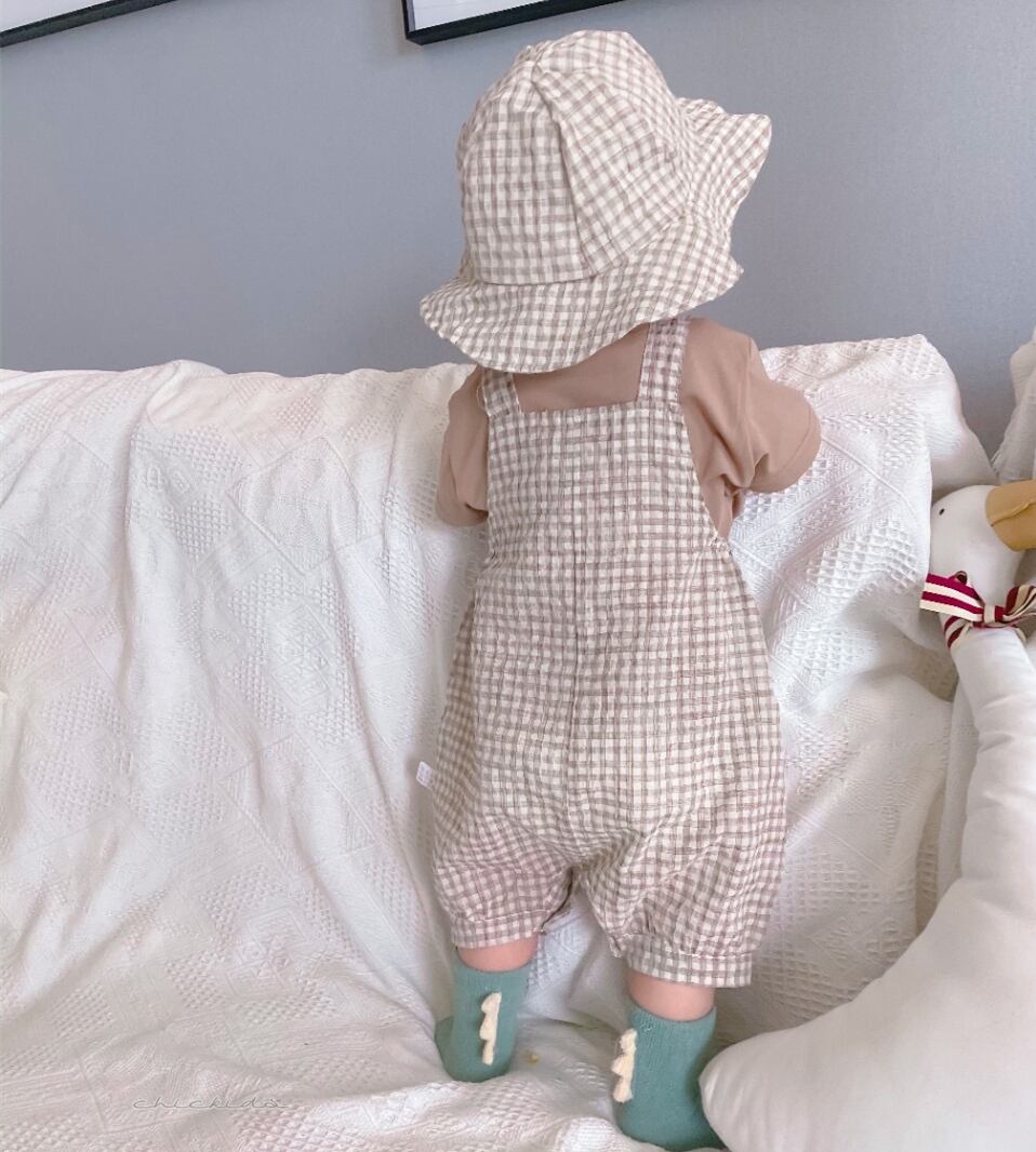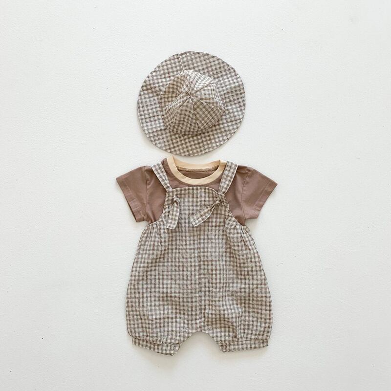 ベビーさんもママも一緒に楽しめる夏新作セットアップが登場しました!チェック柄が可愛いTシャツとロンパース、そしてお揃いの帽子がセットになっていて、コーディネートも簡単です。お色味はベージュとコーヒーで、どちらも爽やかで夏らしい雰囲気。素材は綿100%なので肌触りも抜群です