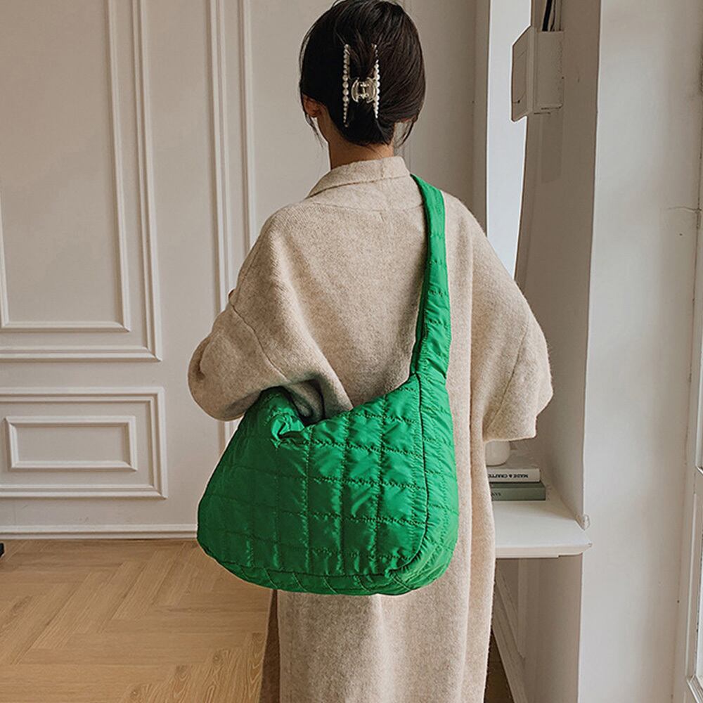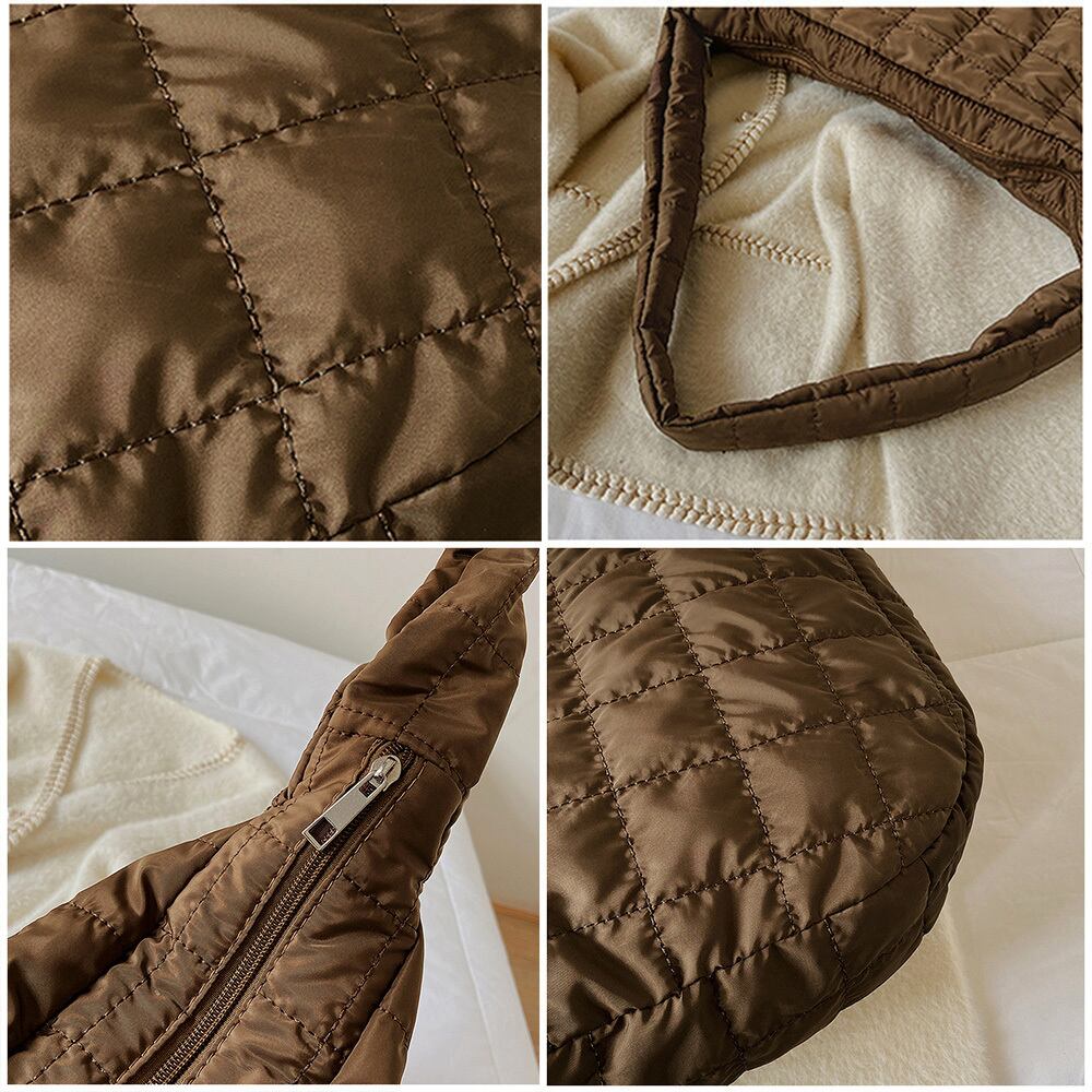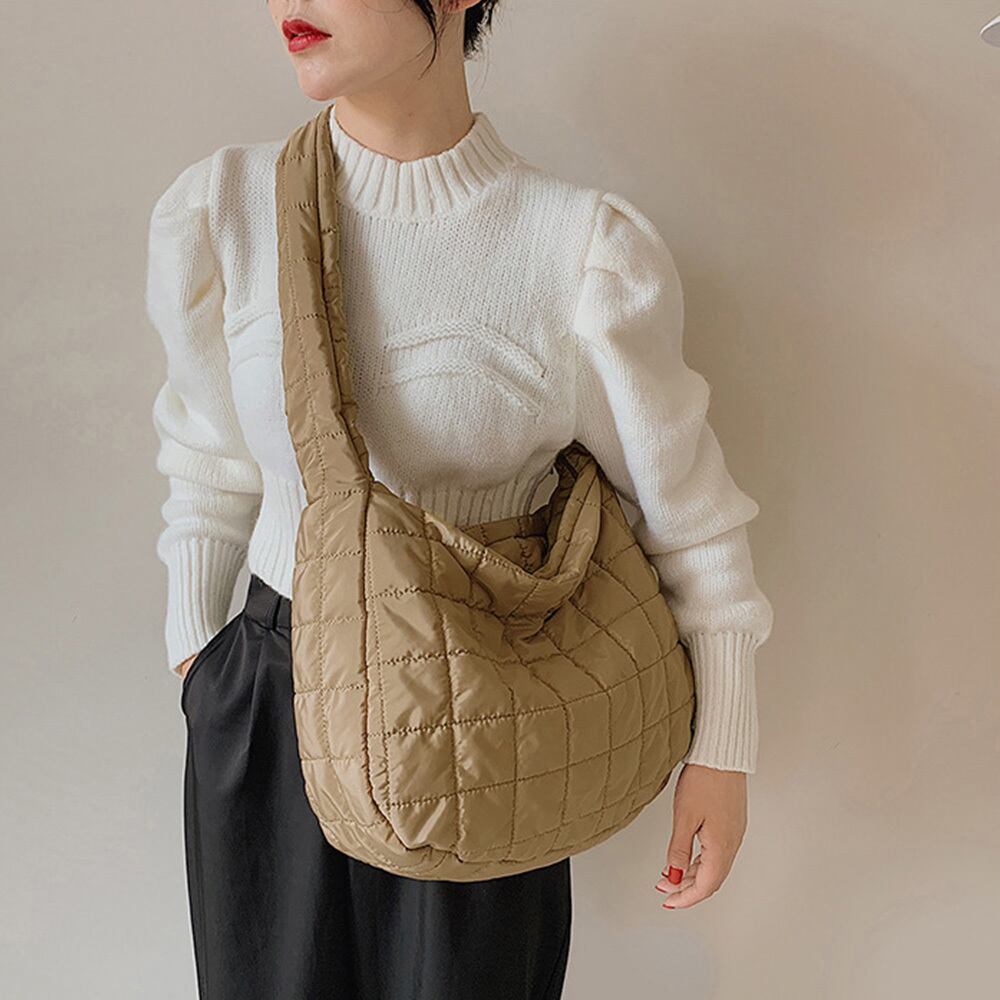 くったりと柔らかい綿入り、ナイロン素材を使用し、キルティング模様で落ち着いた雰囲気のショルダーバッグ