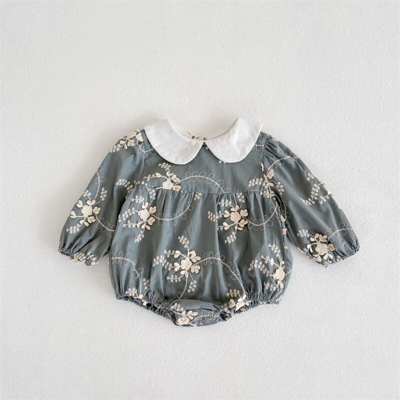 かわいい姉妹おそろいコーデにぴったりの秋新作!ピーターパン襟と刺繍がとっても可愛い長袖ロンパースです。綿素材で作られているので、お肌に優しい着心地が自慢。オフホワイトとグレーの2色展開で、お子様のお好みに合わせて選べます。