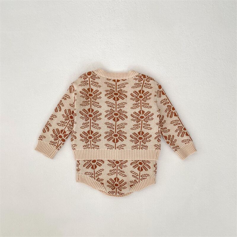 可愛い花柄のジャカードニットトップスセットが新登場!赤ちゃんのかわいさがさらに引き立つ、秋のおしゃれアイテムです。ロンパース&カーディガンの2点セットで、着せ替えの幅も広がります。柔らかな綿100%素材で、赤ちゃんの肌にも優しい。秋のお出かけや撮影時にぴったりなアイテムです。赤ちゃんとの特別な時間を彩る、かわいい一着をお試しください!