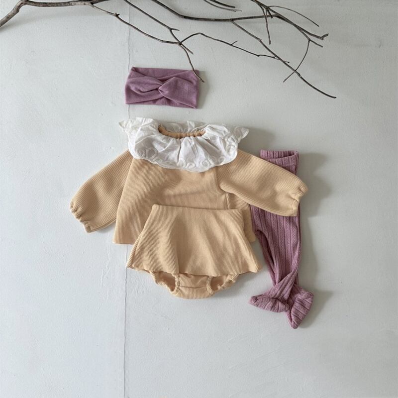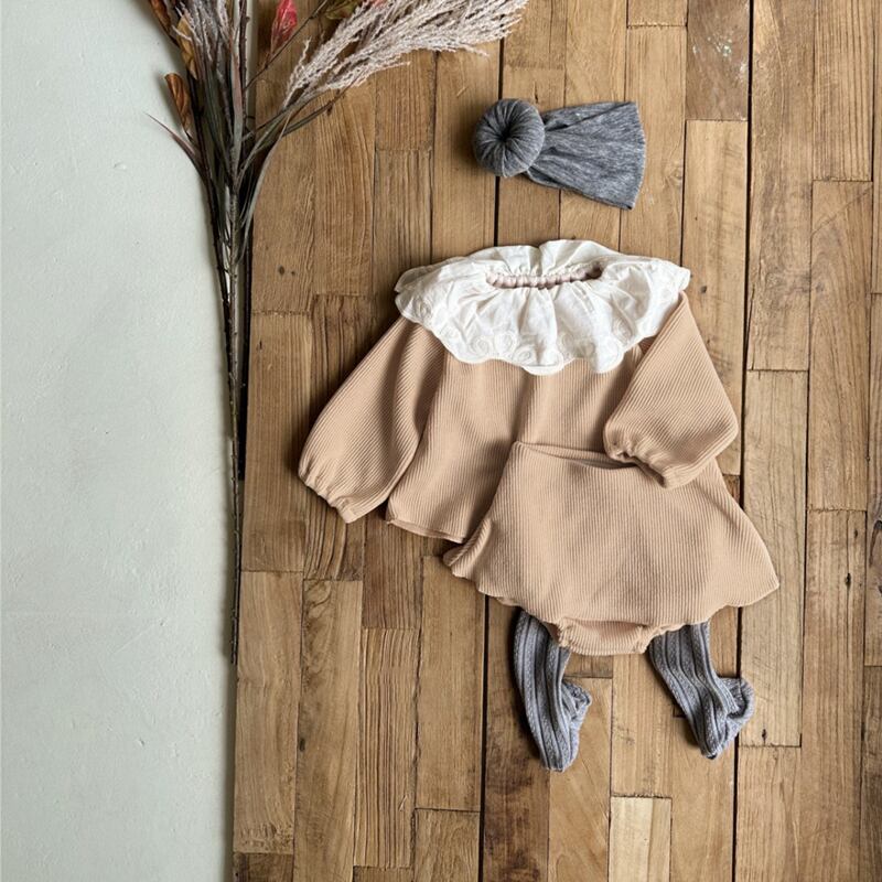 秋新作 ベビー服 リブ セットアップ 長袖Tシャツ ブルマー 無地 子供服 可愛い レース